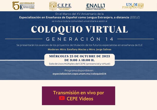 | 13:30 | Ana Fernanda Plascencia Valdez | D | La importancia de la adaptación de la lengua en la elaboración de materiales didácticos para el aprendizaje del español mexicano. | Mtro. Jorge Salinas Hurtado | ||